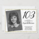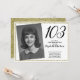 Cette jolie invitation de 103e anniversaire pour elle en blanc et or comprend une photo personnalisable avec une texture de papier aquarelle faux, et établira un ton amusant et célébratif. Remarque : la bordure de feuille est imprimée et non une feuille brillante réelle !