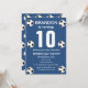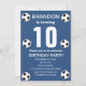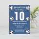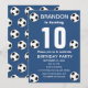 Fête du 10e anniversaire pour un fan de football, des sports, des enfants, des garçons, pour lui. Bleu et blanc, moderne, élégante invitation à la fête d'anniversaire. Veuillez le personnaliser avec vos détails.