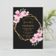 Une invitation à la fête tropicale florale de 16ème anniversaire avec fleurs d'hibiscus roses, verdure et cadre géométrique en faux or. Arrière - plan noir élégant. Modèles pour un nom écrit avec un script moderne de style manuscrit, modèles pour vos informations de fête. Texte noir. Parfait pour un été, une piscine ou une fête de plage ! Retour : arrière - plan noir.