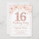 16e anniversaire invitation pour fille. Design floral élégant en faux parties scintillant rose or et blanc. Comprend du bois de diamant, des roses roses et des confettis roses. Parfait pour une célébration anniversaire de sweet sixteen glamour.