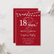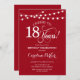 Invitation du 18e anniversaire. Design simple rouge et blanc avec des lumières à cordes féeriques et une police de script. Bravo à 18 ans ! Peut être personnalisé à tout âge! Message-moi si vous avez besoin d'une personnalisation plus poussée.