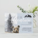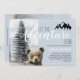 Aventure vous attend, bois rustique ours 1er anniversaire invitation à la fête avec petit ours, dans des teintes douces pastel gris bleu, avec un majestueux pin de la forêt et silhouette de montagne.