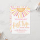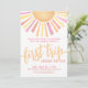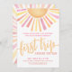 Célébrez votre premier voyage autour du Soleil avec cette invitation de 1er anniversaire brillante et joyeuse. En haut, "First Trip" est présenté en caractères gras calligraphie, donnant un ton joyeux. Le design présente un grand soleil avec des rayons vibrants en jaune, orange, rose et rouge, créant un thème ludique et coloré. Le bas de l'invitation inclut tous les détails de l'événement dans un mélange de polices modernes et de typographie en caractères gras, en utilisant des couleurs qui correspondent aux rayons du soleil. Sur le dos, une version plus grande du soleil coloré brille de mille feux, ajoutant une touche joyeuse. Bien que cette conception soit légèrement plus axée sur l’anniversaire d’une fille, elle demeure merveilleusement neutre sur le plan du sexe. Si vous préférez un look plus vif, il suffit de retirer la couche blanche transparente dans l'éditeur pour améliorer les couleurs du soleil. Cette invitation est parfaite pour célébrer la première année de votre enfant avec un mélange d'éléments boho, rétro et modernes. 1er Anniversaire Premier Voyage Autour Du Soleil Invitation Jolie Aquarelle Jaune Orange Rose Rouge Fille. Disponible sous forme d'invitation imprimée ou d'invitation numérique téléchargeable que vous pouvez envoyer par e-mail ou avoir imprimé localement !