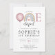 Mignonne petite charmante petite louche ONEderful thème aquarelle boho rainbow fille's 1er anniversaire invitation avec ballons. Un joli ballon et un motif arc-en-ciel à l'arrière de l'invitation, avec des roses pastel, des bleus et de l'or et des petits coeurs roses. Disponible en téléchargement numérique, en version imprimée ou les deux !