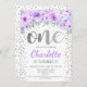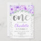 Invitation de fête d'anniversaire. Design élégant en argent faux parties scintillant avec verdure et accent floral. Carte Invitation avec parties scintillant "One" en police de script avec confetti. Violet, blanc et vert menthe. Idéal pour une célébration 1ère anniversaire élégante.