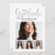 La carte de remise de diplômes et l'invitation de la fête présentent "Graduate" dans un script de calligraphie branché avec un collage photo moderne de quatre (4) photos de la grade. La carte recto verso comprend le libellé de la fête de remise de diplômes "Fêtons-nous" et des détails sur le dos. Design classique noir et blanc aux accents argentés.