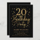 20th birthday party invitation in black and gold. Trendy modern design, perfect for a stylish men's or women's bday celebration. Features script font and confetti. Customize with your own details. Printed Zazzle invitations or instant download digital printable template.
