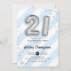 21e anniversaire invitation de fête. Design élégant en argent de parties scintillant faux avec des rayures bleu et blanc d'aqua turquoise. Carte Invitation avec ballons numéro or 21, police de script avec confetti. Parfait pour une célébration anniversaire du 21ème. Message-moi si vous avez besoin d'âge personnalisé.