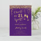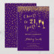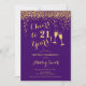 Invitation du 21e anniversaire. Salutations À 21 Ans ! Design élégant en violet et or. Il comprend des verres à champagne, des caractères de script et des confettis. Parfait pour une fête d'anniversaire élégante. Personnalisez avec vos propres détails. Peut être customisé pour montrer n'importe quel âge.