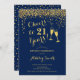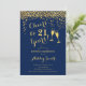 Invitation du 21e anniversaire. Salutations À 21 Ans ! Design élégant en marine et en or. Il comprend des verres à champagne, des caractères de script et des confettis. Parfait pour une fête d'anniversaire élégante. Personnalisez avec vos propres détails. Peut être customisé pour montrer n'importe quel âge.