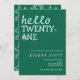 Dites "bonjour à vingt et un" avec cette invitation de fête d'anniversaire adulte moderne et élégant. L'arrière - plan vert simple complète parfaitement le texte blanc et le détail du gâteau d'anniversaire, ajoutant une touche de classe au design. Le texte décontracté exprime un sentiment d'excitation pour la célébration à venir. Cette invitation contemporaine et minimale est parfaite pour une fête d'anniversaire marquant. Disponible en téléchargement numérique pratique, prêt pour vous à personnaliser et envoyer à tous vos proches. Faites de votre 21e fabuleux avec cette invitation pour lui !