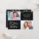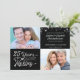Invitez vos invités avec cette invitation pour les 25 ans de mariage en noir et argent avec une typographie moderne rétro indiquant "25 ans de préparation" et vous permet d'inclure leur année de mariage en "fondé en 19XX" intégré dans le design "25 ANS DE PRÉPARATION" et en ajoutant leurs photos d'alors et d'aujourd'hui. Le verso comprend des informations supplémentaires sur l'invitation. CONSEIL PHOTO : Pour des résultats rapides et optimaux, choisissez une photo avec le sujet au milieu et/ou recadrez-la à l'avance à une forme similaire à celle présentée AVANT de la télécharger, et elle remplira parfaitement l'espace photo. Contactez le designer si vous souhaitez que ce design soit modifié ou sur un autre produit pour coordonner ou compléter votre célébration de vos noces d'argent.