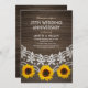 25e Anniversaire de Mariage Rustique Bois Campagne Dentelle et Tournesols Cartons d'Invitation. Personnalisés selon les détails de votre célébration. Vous pouvez le modifier pour les 10e, 30e, 40e, 50e, 60e anniversaires, etc. Caractéristiques belles dentelles, tournesols et typographie sur un fond en bois sombre rustique. Grands cartons d'invitation d'anniversaire de mariage élégants pour des anniversaires de mariage champêtres créatifs. Ce carton d'invitation d'anniversaire de mariage est conçu par superdazzle.com
