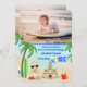 Cette mignonne invitation de premier anniversaire de plage PHOTO pour les garçons présente un adorable bébé de plage sirotant son aide au citron. Il se tient debout avec son crabe, un impressionnant château de sable et sa planche de surf, le tout entouré de palmiers tropicaux. Ajoutez une photo à l'avant et à l'arrière de cette invitation.