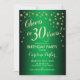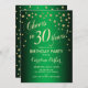 30th Birthday Party Invitation Design élégant avec fausse parties scintillant or et vert. Comprend des polices de caractères et des confettis stylisés. Bravo à 30 ans !