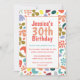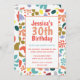 Customisez une invitation moderne pour le 30e anniversaire avec les détails de votre fête. Coloré, élégant, urbain, Flat Design style. Avant a des détails d'invitation d'anniversaire. L'inverse a le design moderne imprimé plus grand. Modifiez facilement le nom, l'âge et les détails de l'invitation à vos besoins. Voir notre collection pour les fournitures de soirée correspondantes.