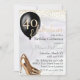 Cette invitation personnalisée présente un thème glamour de fête du 40e anniversaire sur un arrière - plan de design satiné blanc. Un grand ballon noir est placé sur la gauche avec "40" imprimé dans une feuille d'or. L'information de l'événement suit le titre "40 & fabulous". Une paire de stilettos à talon doré brillant est représenté en bas à gauche. Des confettis de parties scintillant dorée glamour accentuent les parties supérieure et inférieure. Il est parfait pour un anniversaire, un anniversaire ou toute autre occasion spéciale.