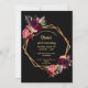 Devant : Une invitation pour une fête de 40e anniversaire. Un arrière - plan noir chic avec un cadre géométrique en faux or. Décorée de fleurs bordeaux foncé et roses, de plumes roses et boho. Modèles pour un nom et les détails de la fête. Le nom est écrit avec un script de style écrit à la main, des lettres de couleur dorée. Retour : arrière - plan noir et grand roses luxuriants en bordeaux et violet.