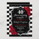 Invitation de fête pour les 40 ans de mariage rouge rubis. Élégante carte d'invitation rouge, noire et blanche avec faux argent scintillant. Caractéristiques de rayures noires et blanches stylées, police de caractères script et roses rouges. Parfait pour une célébration de 40 ans de mariage.