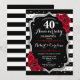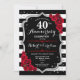Invitation de fête d'anniversaire de mariage de 40 ans rouge rubis. Carte d'invitation élégante rouge, noire et blanche avec faux strass argenté. Caractéristiques élégantes rayures noires et blanches, police de caractères script et roses rouges. Parfait pour une célébration de 40 ans d'anniversaire de mariage.
