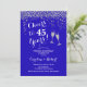 Invitation d'anniversaire de mariage de 45 ans bleu royal. À 45 ans ! Design élégant en bleu saphir et argent. Comporte des verres à champagne, une police de caractères script et des confettis. Parfait pour une célébration élégante de 45 ans de mariage. Invitations Zazzle imprimées ou modèle numérique à télécharger instantanément. Peut être personnalisé pour afficher n'importe quelle année ! Personnalisez avec vos propres détails.