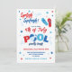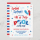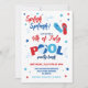 Une invitation amusante 4 juillet Pool Party dans un jeu de couleurs rouge et bleu avec un design rayé à l'arrière. Parfait pour une fête d'été patriotique !