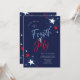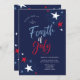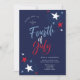 4 juillet Red White Blue Fireworks Party Invitation présente des étoiles rouges, blanches et bleues, ainsi que des détails de feu d'artifice et de la calligraphie moderne.