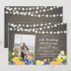 Célébrez votre jour spécial avec cette invitation personnalisée pour votre anniversaire de mariage. Ce design présente de belles fleurs bleues et jaunes et des guirlandes lumineuses sur un fond en bois rustique. Vous pouvez personnaliser le texte pour n'importe quelle année. Remplacez la photo exemple par votre propre photo. Des articles de fête assortis sont disponibles dans ma boutique BaraBomDesign.
