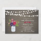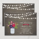 Célébrez votre jour spécial avec cette invitation d'anniversaire surprise élégante. Ce design présente des guirlandes lumineuses, un bouquet de fleurs aux couleurs de l'automne (rouge et violet) avec un pot Mason sur un fond en bois rustique. Vous pouvez personnaliser le texte à n'importe quel âge ou événement. Ajoutez les initiales du couple sur le cœur en forme de graphique sur un pot Mason.