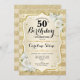 Invitation du 50e anniversaire. Design floral élégant en or et blanc. Comprend des rayures d'or de parties scintillant, des roses blanches, des polices de caractères stylisées et des confettis. Parfait pour une fête d'anniversaire glam.
