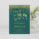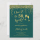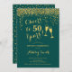 Invitation du 50e anniversaire. Salue À 50 Ans ! Design élégant en vert émeraude et or. Il comprend des verres à champagne, des caractères de script et des confettis. Idéal pour une soirée de cinquantième. Personnalisez avec vos propres détails. Peut être customisé pour montrer n'importe quel âge.