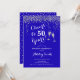 Invitation du 50e anniversaire. Salue À 50 Ans ! Design élégant en bleu royal, blanc et argent. Il comprend des verres à champagne, des caractères de script et des confettis en argent parties scintillant. Idéal pour une soirée de cinquantième. Personnalisez avec vos propres détails. Peut être customisé pour montrer n'importe quel âge.