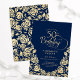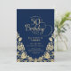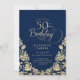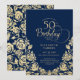 Invitation d'anniversaire 50 ans élégante bleu marine or. Design classe avec des roses, fausse feuille d'or et police de caractères script. Carte d'invitation tendance parfaite pour une célébration d'anniversaire féminine stylée. Personnalisez avec vos propres détails. Peut être personnalisé pour n'importe quel âge. Cartes d'invitation Zazzle imprimées ou modèle de template numérique imprimable instantané.