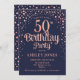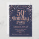 Invitation à la fête du 50e anniversaire. Design élégant en bleu marine et faux parties scintillant rose or. Comprend des polices de caractères et des confettis stylisés. Message-moi si vous avez besoin d'âge personnalisé.