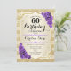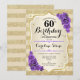Invitation pour un 60e anniversaire. Design élégant en or et violet. Comprend des bandes dorées à effet pailleté, des roses violettes, une police script stylisée et des confettis. Parfait pour une fête d'anniversaire glamour.