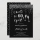 Invitation du 60e anniversaire. Salutations À 60 Ans ! Design élégant en noir, blanc et argent. Il comprend des verres à champagne, des caractères de script et des confettis. Idéal pour une soirée de soixantième anniversaire. Personnalisez avec vos propres détails. Peut être customisé pour montrer n'importe quel âge.