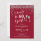 Invitation du 60e anniversaire. Salutations À 60 Ans ! Design élégant en rouge, blanc et argent. Il comprend des verres à champagne, des caractères de script et des confettis en argent parties scintillant. Idéal pour une soirée de soixantième anniversaire. Personnalisez avec vos propres détails. Peut être customisé pour montrer n'importe quel âge.
