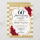 Invitation élégante pour la célébration du 60e anniversaire de mariage. Invitation imprimée ou modèle numérique en blanc, rouge et or faux. Caractéristiques : rayures, police de caractères script et roses rouges. Peut être personnalisé pour n'importe quelle année de mariage.