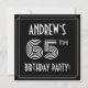The front of this Roaring Twenties inspired sixty-fifth birthday party/celebration invitation card design features a customizable name, a fancy art deco look inspired number “65th”, the message “BIRTHDAY PARTY!”, and a multi-line border. The background of the front is colored black by default, but it can be customized to a different color if desired. The back features personalized details about the event, such as the date, time, location/venue, and any other information that may be useful. Luxurious, stylish, customizable invitations like these might be used to invite attendees/guests to a birthday party being held to celebrate somebody’s 65th birthday. [~Z0000615]