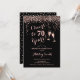 Invitation du 70e anniversaire. Salue À 70 Ans ! Design élégant en or noir et rose. Il comprend des verres à champagne, des caractères de script et des confettis. Parfait pour une soirée de soixante-dixième anniversaire. Personnalisez avec vos propres détails. Peut être customisé pour montrer n'importe quel âge.