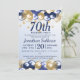 A stylish 70th birthday Party Invitation . Design features navy blue and gold balloons, Gold glittery starts and navy blue text all on a pale blue gradient background. A lovely design inviting your guests to join you for a 70th birthday party celebration. Easy to customize with your own party details.