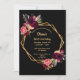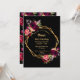 Devant : Une invitation pour une fête de 80ème anniversaire. Un arrière - plan noir chic avec un cadre géométrique en faux or. Décorée de fleurs bordeaux foncé et roses, de plumes roses et boho. Modèles pour un nom et les détails de la fête. Le nom est écrit avec un script de style écrit à la main, des lettres de couleur dorée. Retour : arrière - plan noir et grand roses luxuriants en bordeaux et violet.