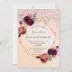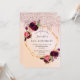 Sur le devant : Une invitation pour une fête de 80 ans, 80ème anniversaire. Un arrière - plan rose doré, rose vif et sombre, avec un cadre géométrique faux or. Décoré de fleurs violettes foncées et bordeaux, de plumes roses et boho. Faux rose parties scintillant or goutte à goutte, la peinture goutte à goutte. Modèles pour un nom et les détails de la fête. Le nom est écrit avec un script de style écrit à la main, des lettres de couleur grise. Dos : or Rose, rose pâle dégradé de couleur arrière - plan et gouttes de parties scintillant.