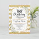 90e Invitation d'anniversaire. Design classique avec des rayures d'or en parties scintillant imitation, des roses blanches et des confettis. Dispose d'un script élégant. Parfait pour une soirée d'anniversaire élégante. Peut être customisé à n'importe quel âge.