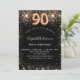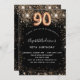 Une invitation moderne, élégante et glamour pour une fête de 90ème anniversaire. Un arrière - plan noir décoré de parties scintillant en faux or brille. Le nom est écrit avec un script de style moderne écrit à la main. Personnalisez et ajoutez les détails de votre fête. Le numéro 90 est écrit avec une police de style ballon, script.