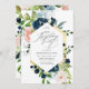 Invitez vos invités à votre fête de 90e anniversaire avec style avec cette élégante invitation personnalisée de fête d'anniversaire florale avec des roses aquarelles rose saumon et bleu marine peintes à la main avec de la verdure et un script noir moderne. Personnalisez tous les détails de votre fête avec une typographie de script noir. Le dos de la carte a un motif de roses aquarelles assorties. Conçu par Susan Coffey.