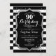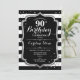 90e Invitation d'anniversaire. Design noir élégant avec faux argent. Bandes noires et blanches avec confettis de diamants de parties scintillant. Parfait pour une soirée d'anniversaire élégante.
