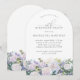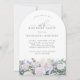 L'élégant agencement floral rose et bleu fleur sauvage orne le fond de cette invitation d'anniversaire en forme d'arc moderne. 90th est écrit dans une police de script moderne. Le reste du texte est une serif spacieuse.