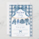 Cool, casual, and full of charm, this blue jean baby shower invitation features a sweet denim clothesline hung with tiny boy clothes, shoes, and denim accessories on a classic blue gingham background. Perfect for a "Blue Jean Baby Is On The Way" theme, denim baby shower, or boy clothesline baby shower, this invitation brings a laid-back, effortlessly cool vibe to any baby celebration.