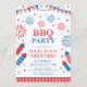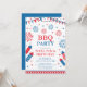 Invitation à une fête de barbecue festive du 4 juillet avec cadre de bordure, drapeaux et feux d'artifice isolés sur fond blanc. Conception pour les invitations du jour de l'indépendance américaine. Typographie personnalisable en rouge et bleu.